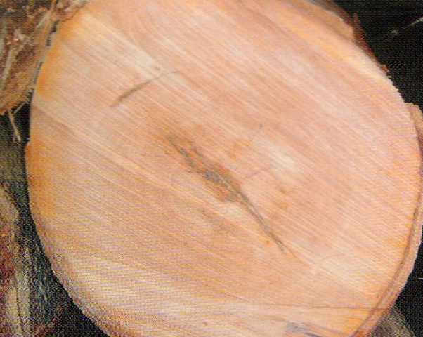 心邊材區(qū)別不明顯。木材淺粉紅褐色至紅褐色。生長(zhǎng)輪略可見(jiàn),不均勻。
