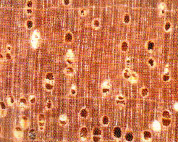 散孔材。管孔肉眼下明顯,甚少,略大;主為單管孔,少數(shù)徑列復(fù)管孔(2~3個(gè));具白色沉積物。軸向薄壁組織放大鏡下略見,環(huán)管束狀及輪界狀。木射線放大鏡下可見,略密,甚窄。